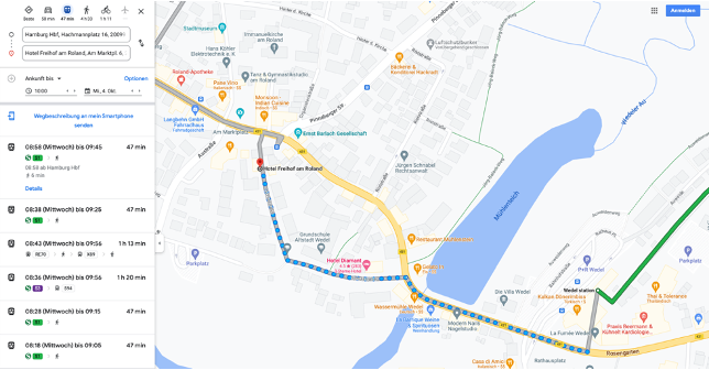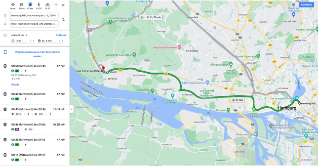You can reach the hotel by long-distance train either directly from Hamburg main station or via Hamburg-Altona, where you can transfer to the S-Bahn line S1 in the direction of Wedel. The hotel is only a 5-minute walk from Wedel station.